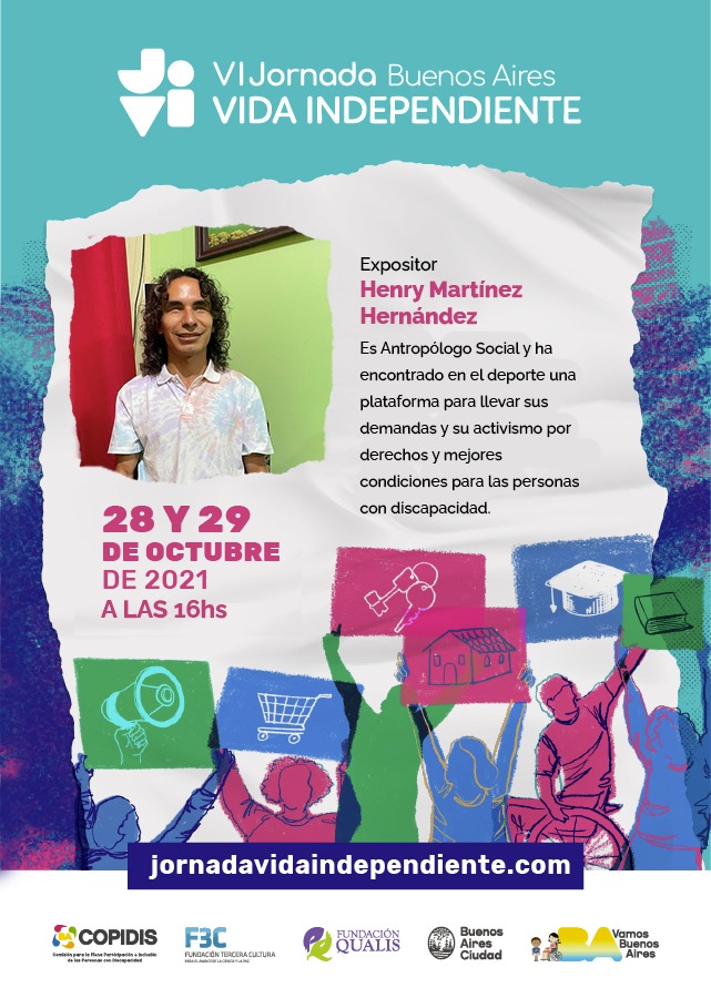 Descripción de la imagen:Placa celeste, azul y magenta con el título: VI Jornada Vida Independiente. Buenos Aires. En el centro papel irregular blanco con el retrato del expositor y el texto: 28 y 29 de octubre de 2021 a las 16hs seguido del texto de la publicación.