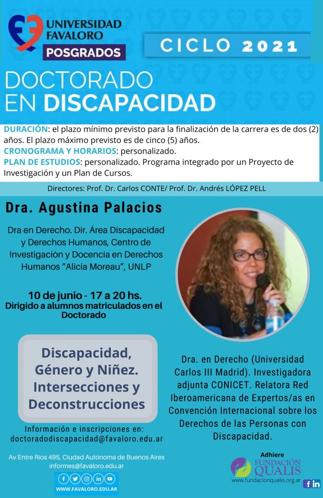 La clase, prevista en el marco del Doctorado en Discapacidad de la Universidad Favaloro, será el 10 de junio y estará a cargo de la Dra. Agustina Palacios.